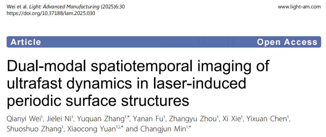 日前,相关论文以《双模态时空成像技术揭示超快激光诱导周期性表面结构的超快动力学》(Dual-modal spatiotemporal imaging of ultrafast dynamics in laser-induced periodic surface structures)为题发表在 Light:Advanced Manufacturing[1]。深圳大学韦芊屹博士和倪洁蕾副研究员是共同第一作者,闵长俊教授、袁小聪教授和张聿全副教授担任通讯作者。