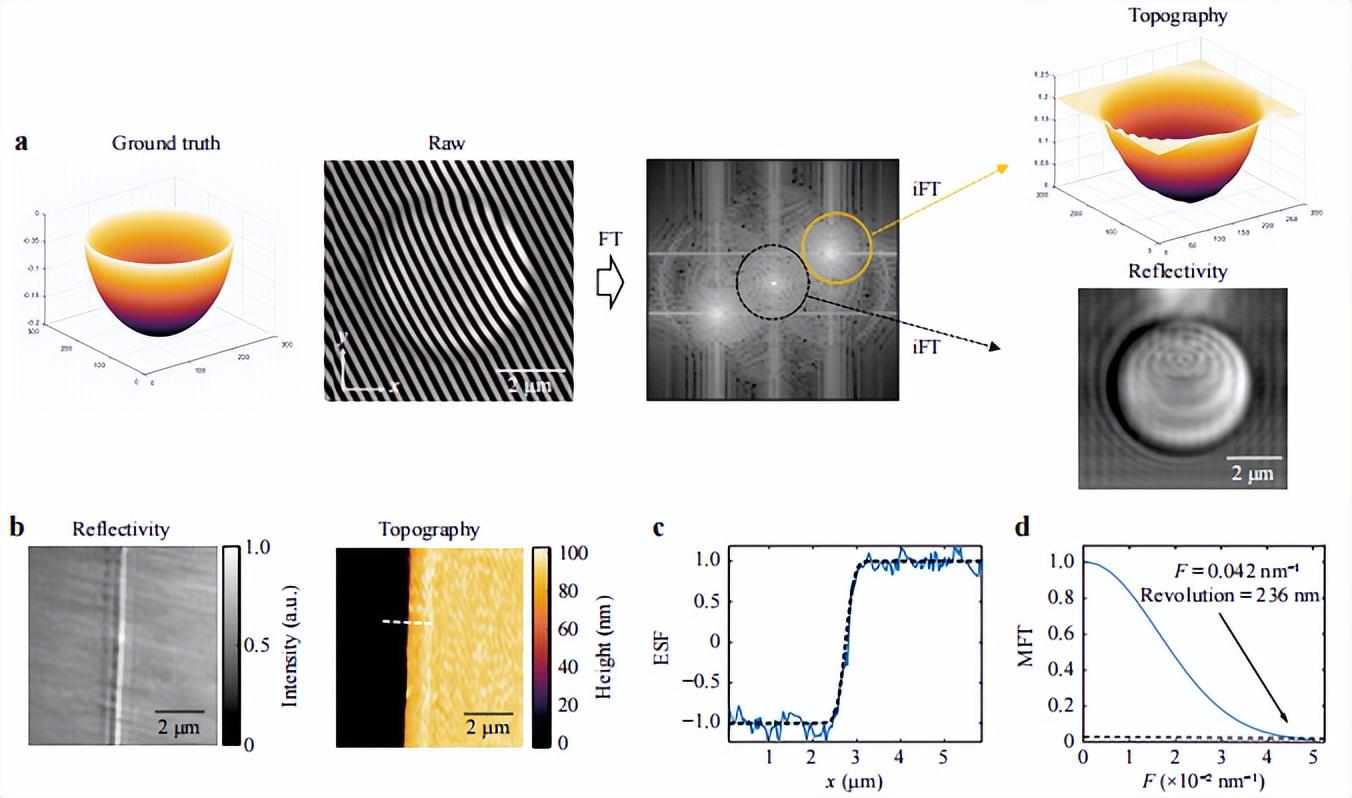 在泵浦探测成像时,通常是测量样品的反射率信息,一次拍照只能得到一张明暗的二维图片。值得关注的是,研究团队结合了泵浦探测技术和干涉成像,通过傅里叶变换提取了零级和一级频谱分量来重建图像。这样不仅可提取出相位信息,还能通过相位反解出高度和反射光的强度。