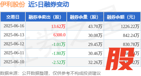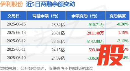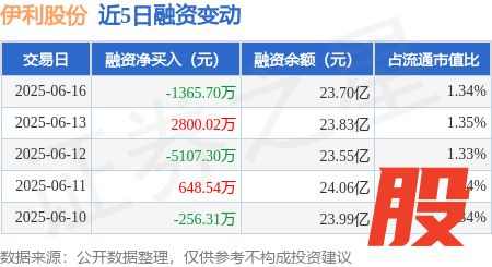 本站消息,6月16日,伊利股份(600887)融资买入3602.93万元,融资偿还4968.63万元长红配资,融资净卖出1365.7万元,融资余额23.7亿元。